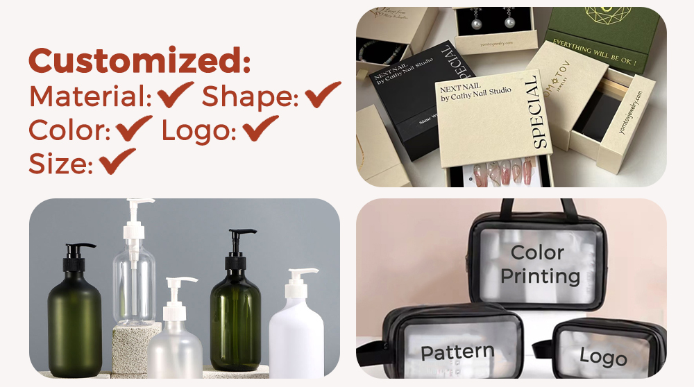 Customized elements(color, material, size, text, pattern, etc.) are defined by you.